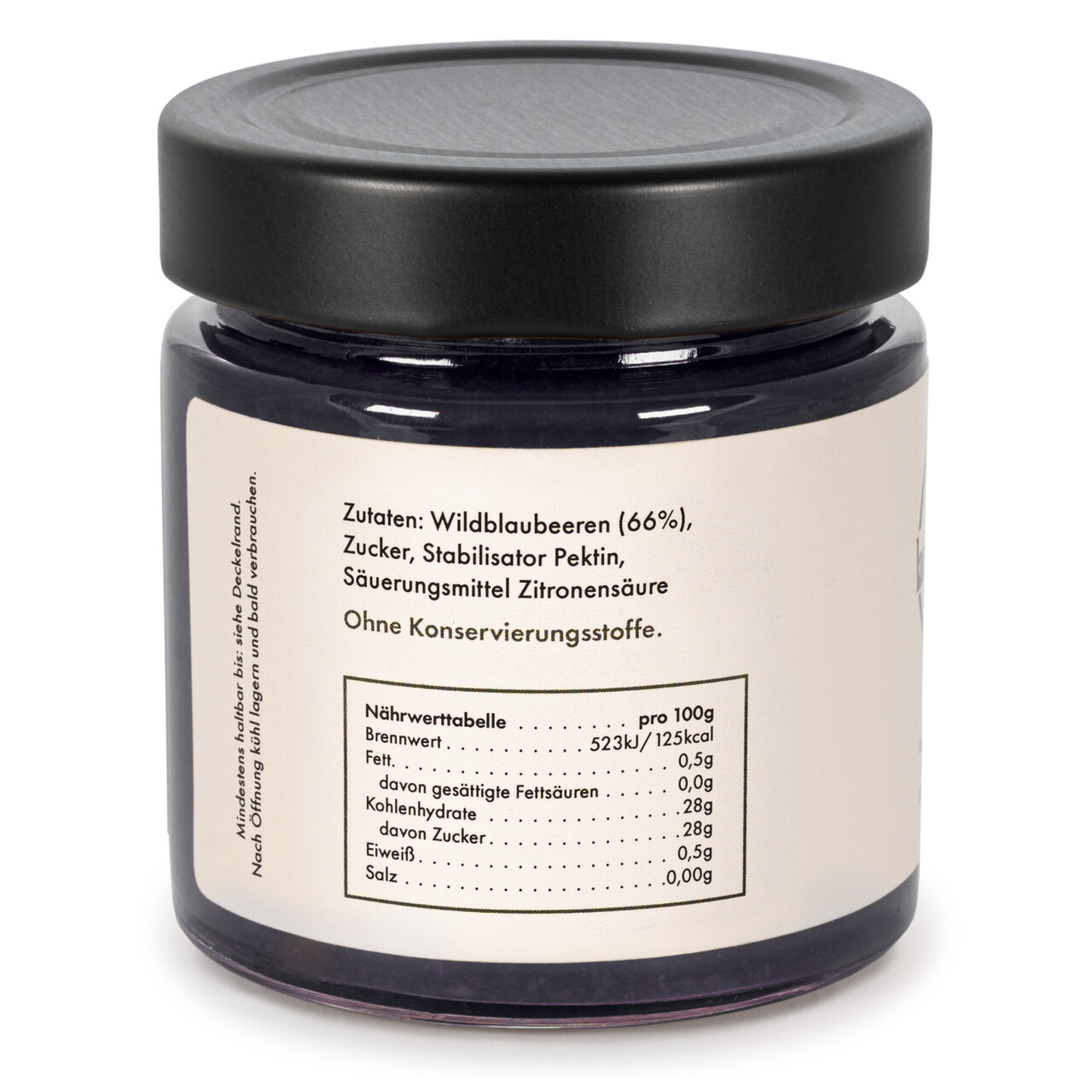 Wildblaubeeren (66%), Zucker, Stabilisator Pektin, Säuerungsmittel Zitronensäure
