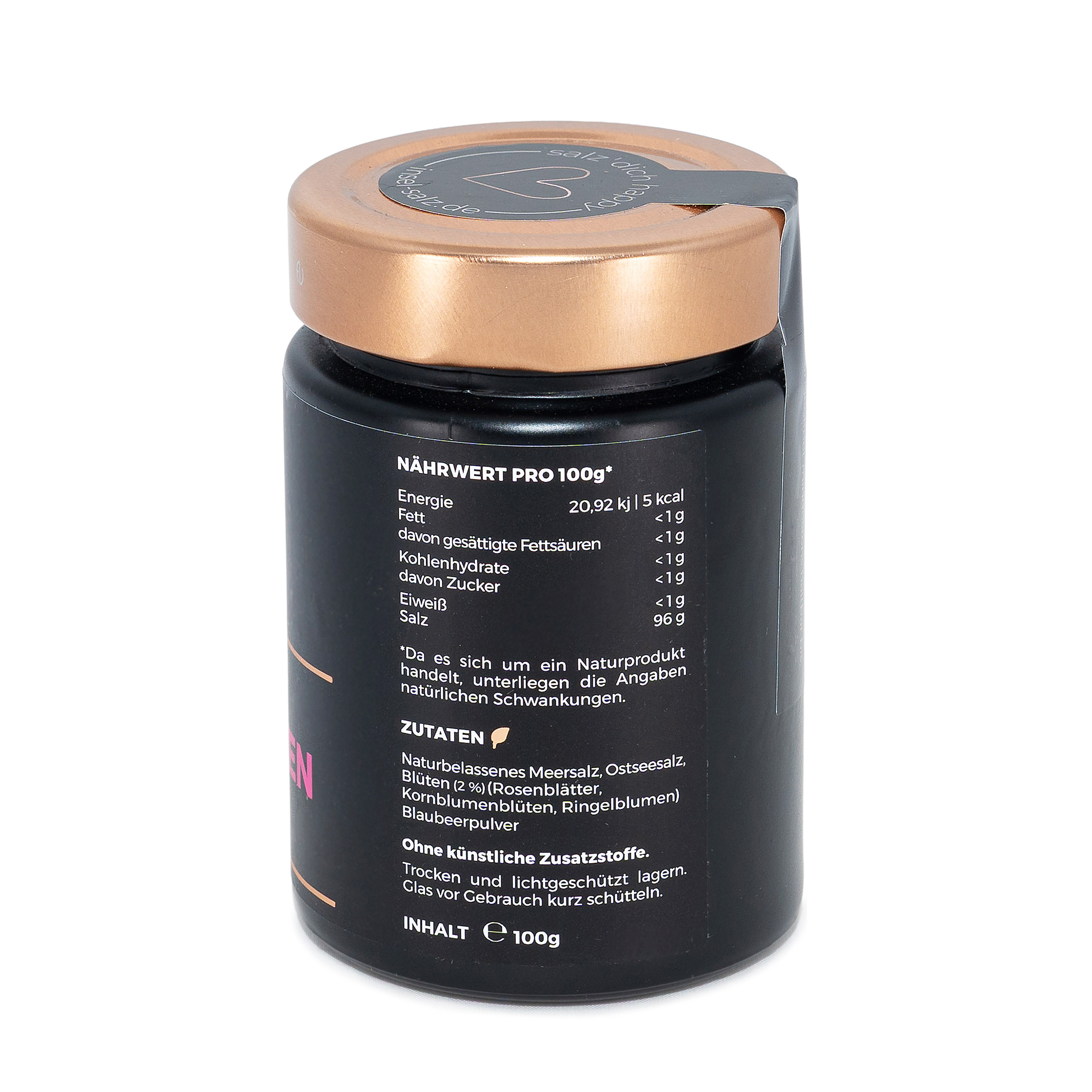 Naturbelassenes Meersalz, Blüten (2% - Rosenblätter, Kornblumenblüten, Ringelblumen), Ostseesalz, Blaubeerpulver